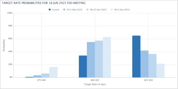 At the same time, expectations for Fed policy are undergoing a recalibration. With the labor market holding firm and inflation still persistent, the urgency for another rate cut has diminished. Fed fund futures are now pricing just a 35% chance of a cut in June — down sharply from 63% a week ago and nearly 80% at the start of April. Importantly, this moderation in rate cut bets is being absorbed without negative market reaction, signaling that investors are comfortable with Fed remaining on hold for longer.