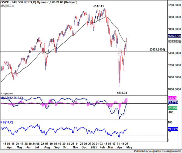 Technically, S&P 500’s rally from the 4835.04 low is seen as the second leg in the medium-term pattern from 6147.43 record high. Further upside is favored in the near term as long as 5433.24 support holds. But significant resistance around 6147.43 to bring the third leg of the pattern.
