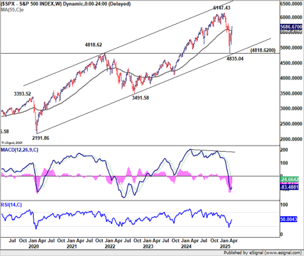 In the bigger picture, the long term up trend remains intact. S&P 500 is well supported by long term rising channel, and managed to defend 4818.62 resistance turned support (2022 high).