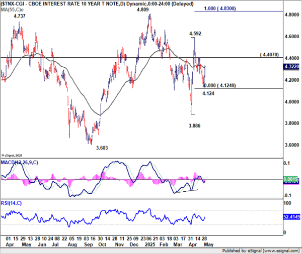 Technically, 10-year yield’s pull back from 4.592 has likely completed with three waves down to 4.124. Break of 4.407 resistance will solidify this bullish case. Rise from 3.886 could then be resuming through 4.592 resistance to 100% projection of 3.886 to 4.592 from 4.124 at 4.830.