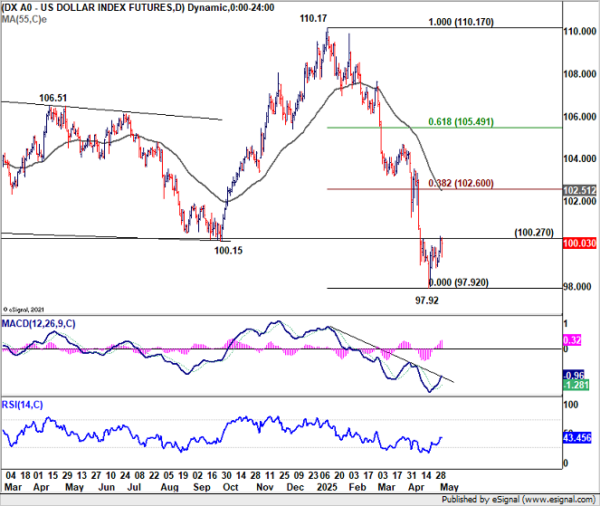 Technically, firm break of 100.27 resistance in Dollar Index will bring stronger rebound back to 55 D EMA (now at 102.51). But strong resistance should be seen from 38.2% retracement of 110.17 to 97.92 at 102.60 to limit upside.