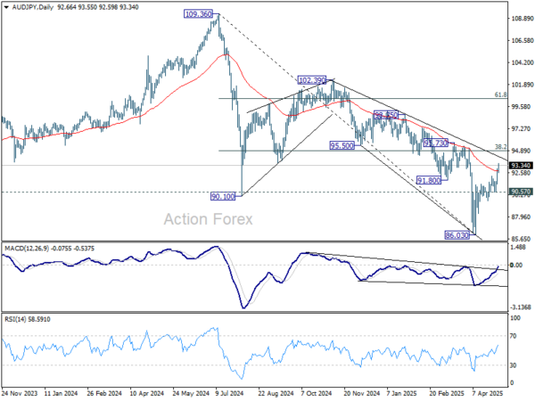 Further rally should be seen in the near term as long as 90.57 support holds, to 38.2% retracement of 109.36 to 86.03 at 94.94. Sustained break there will pave the way to 61.8% retracement at 100.44.