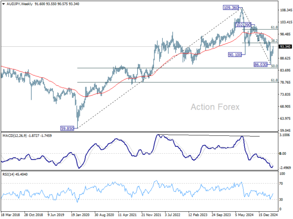 Technically, the developments continue to affirm the case that corrective fall from 109.36 (2024 high) has completed with three waves down to 86.03.