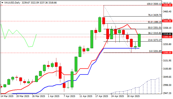Ability to hold above $3300 would keep near term bias with bulls, and daily close above $3315 to validate signal and open way for further recovery and expose targets at $3351 / $3386 (Fibo 50% and 61.8% retracement of $3500/$3201 respectively).