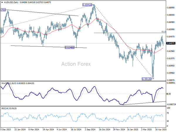AUD/USD retreated after edging higher to 0.6511 last week, but downside is contained above 0.6364 support so far. Initial bias stays neutral this week first. On the upside, break of 0.6511 will resume the rally from 0.5913 to 61.8% retracement of 0.6941 to 0.5913 at 0.6548. However, considering bearish divergence condition in 4H MACD, break of 0.6364 support should confirm short term topping. Intraday bias will be turned back to the downside for 38.2% retracement of 0.5913 to 0.6511 at 0.6283.