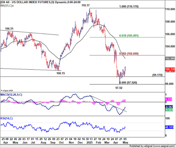 Technically, corrective rise from 97.92 could extend higher towards 55 D EMA (now at 102.08). But strong resistance should be seen from 38.2% retracement of 110.17 to 97.92 at 102.60 limit upside. On the downside, break of 99.17 support would argue that the corrective recovery has completed earlier than expected, and bring retest of 97.92 low next.