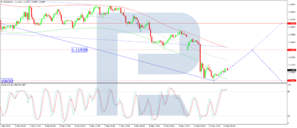 On the H1 chart, the market has achieved the local downside target at 1.1065. Today, a potential rebound to 1.1126 is in focus. If this level is breached upwards, a further correction towards 1.1190 may follow. Subsequently, the downward trend could resume, targeting 1.1040. This outlook is supported by the Stochastic oscillator, whose signal line is above 80 but poised to decline towards 20.