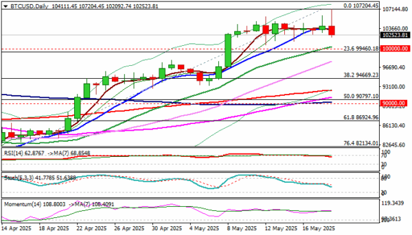 Bitcoin reacted negatively to US rating downgrade and the price fell to the lower side of recent congestion (101K/107K) where it has been established after bulls faced strong headwinds on approach to new record high, but bids remained strong and limited dips.