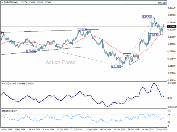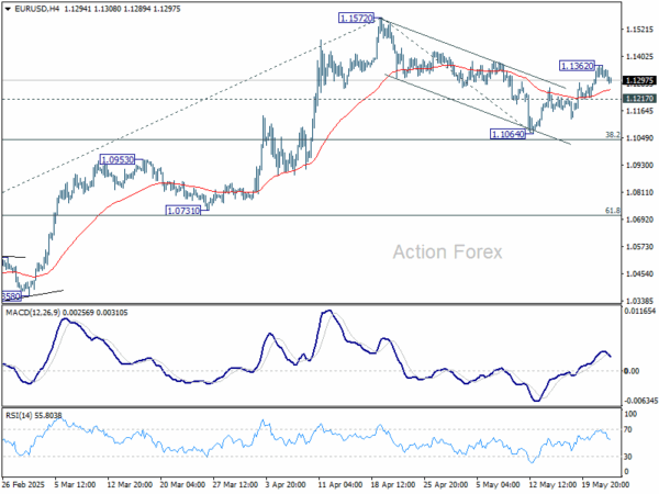 Intraday bias in EUR/USD is turned neutral first with current retreat. But further rise is expected as long as 1.1216 support holds. Correction from 1.1572 could have completed at 1.1064 already. Above 1.1362 will bring retest of 1.1572 first. Firm break there will resume larger up trend. Next near term target will be 61.8% projection of 1.0176 to 1.1572 from 1.1064 at 1.1927. However, break of 1.1217 will turn bias back to the downside for 1.1064 support instead.