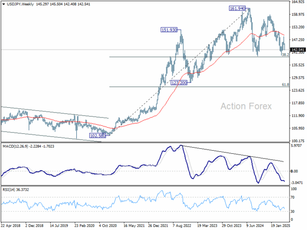In the bigger picture, price actions from 161.94 are seen as a corrective pattern to rise from 102.58 (2021 low), with fall from 158.86 as the third leg. Strong support should be seen from 38.2% retracement of 102.58 to 161.94 at 139.26 to bring rebound. However, sustained break of 139.26 would open up deeper medium term decline to 61.8% retracement at 125.25.