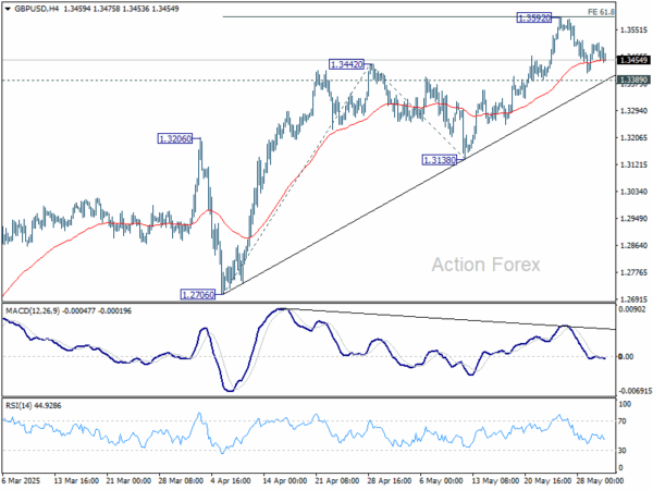 GBP/USD edged higher to 1.3592 last week, but retreated since then. Initial bias remains neutral this week for consolidations. Further rally is expected as long as 1.3389 support holds. Break of 1.3592 will resume larger up trend to 100% projection of 1.2706 to 1.3442 from 1.3138 at 1.3874. However, decisive break of 1.3389 will confirm short term topping, and turn bias back to the downside for 1.3138 support instead.