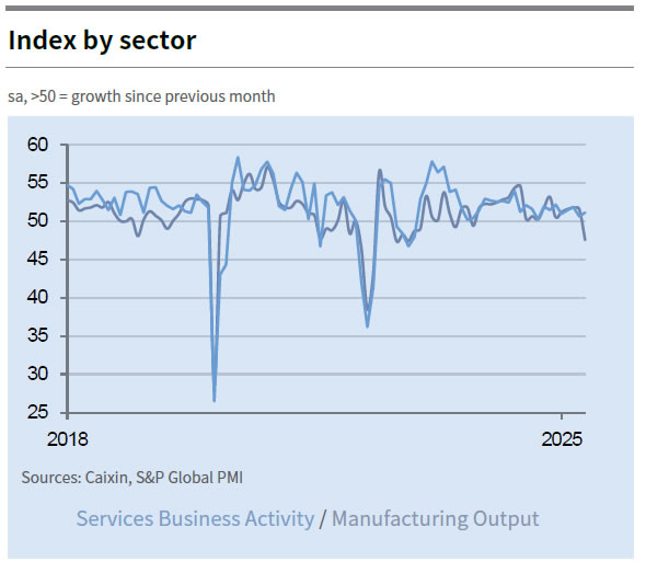 Wang Zhe of Caixin Insight Group noted that the manufacturing slump was weighing heavily on the overall market, with new export orders remaining “sluggish” across both goods and services. Although input costs rose slightly, firms were unable to pass these on to customers, with selling prices continuing to fall and compressing profit margins.