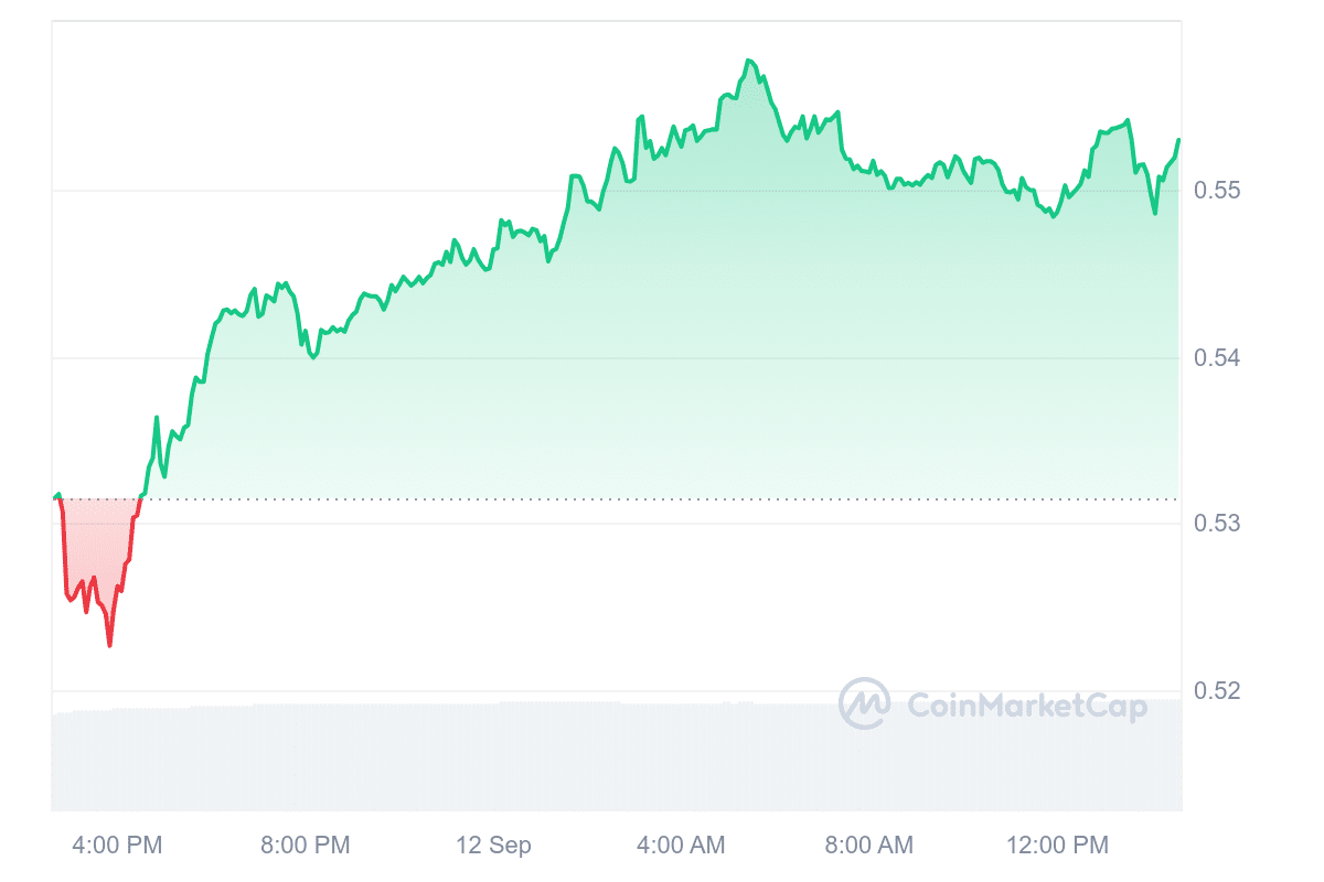 Binance Coin (BNB) has experienced steady growth, marking its fifth consecutive day of rising prices. It reached an intraday peak of $545, the highest since August 27, and 15% above its lowest point this month. This represents a notable recovery of over 36% from August’s lows, in line with the broader crypto market, including coins like Sui (SUI), Popcat (POPCAT), and BinaryX (BNX), which also saw gains.