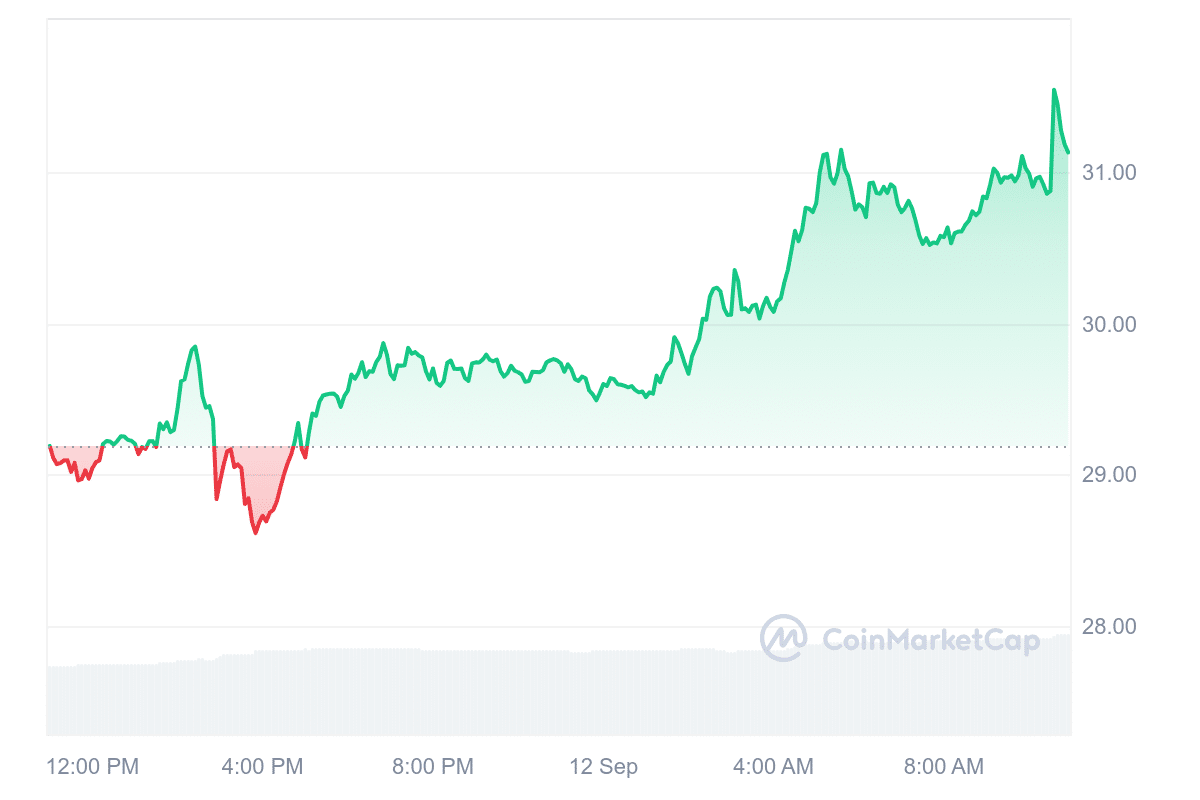 The current price of ORDI (ORDI) is $30.72, reflecting a 3.59% increase over the past 24 hours. Over the past year, ORDI has surged 879%, outperforming 96% of the top 100 cryptocurrencies. Notably, it has outpaced both Bitcoin and Ethereum during this period.