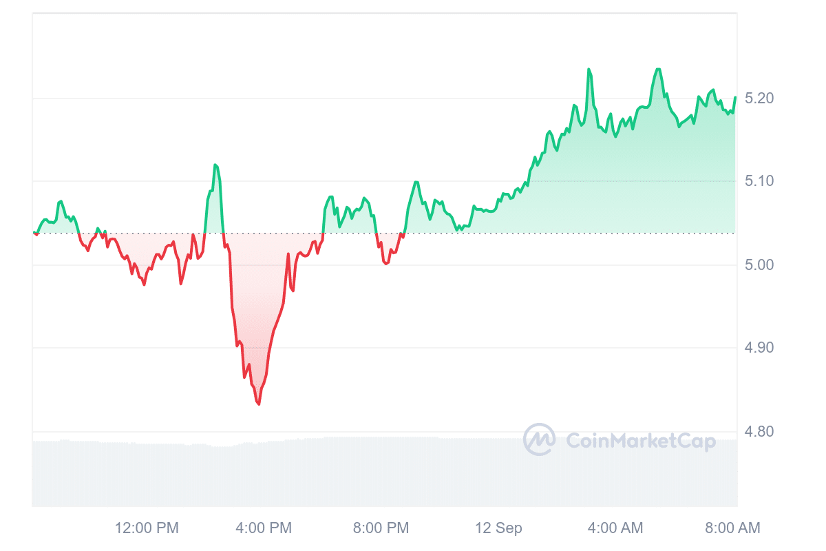 Render’s current market trend indicates a positive outlook. For instance, RENDER trades at $5.19, marking a 3.01% rise in the last 24 hours. Year-to-date (YTD), the token has recorded a 250% surge, outperforming 82% of the top 100 crypto assets. Moreover, the token has recorded 16 green days in the past month.
