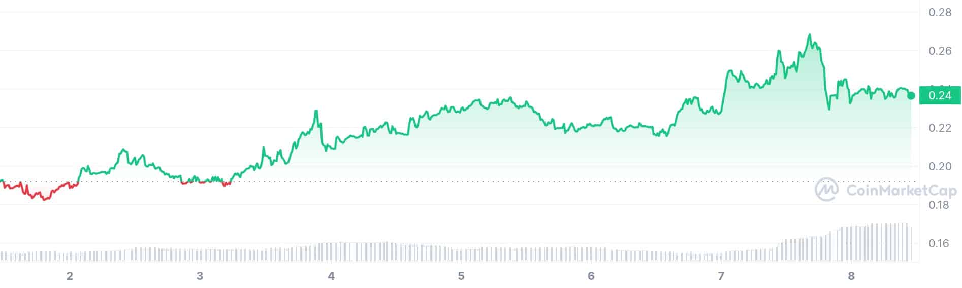 Clearpool’s robust market cap demonstrates a high level of liquidity. Moreover, its 200-day SMA is $0.13, indicating a 138% uptick. The token currently trades at $0.2366 and is projected to be worth $1 by the end of 2024.