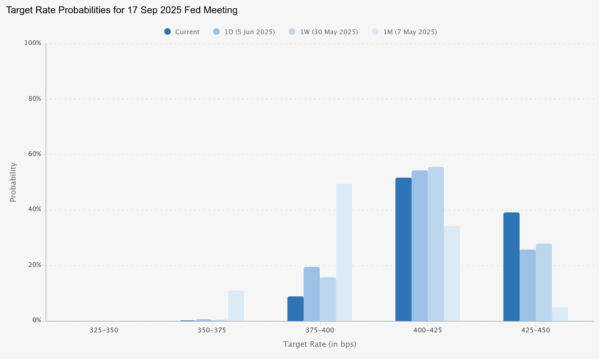 In response, market pricing for Fed policy has shifted. A rate hold at the June FOMC meeting is now virtually assured. Fed fund futures currently show an 83% chance of no change in July, up from 74% a week ago. September pricing has also adjusted notably, with odds of a hold rising to nearly 40%, from just 28% last week.