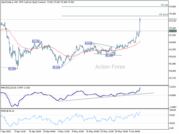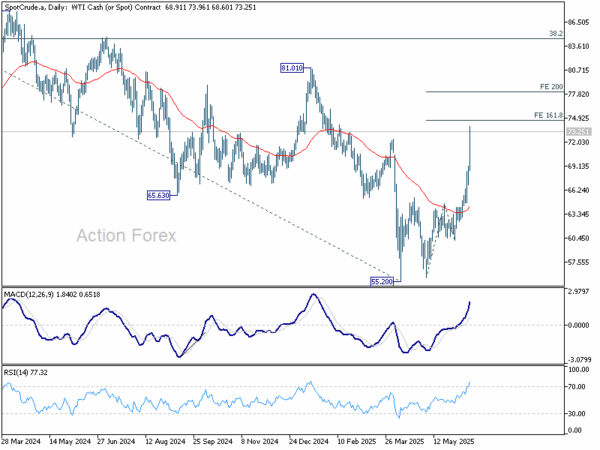 Technically, despite the sharp rally in WTI oil, strong resistance is expected between 74.65 and 78.08 to limit upside 161.8% projection of 55.63 to 64.60 from 60.14. at 74.65 and 200% projection at 78.08), on overbought condition. Break of 69.11 resistance turned support would indicate that the current buying wave has likely peaked.