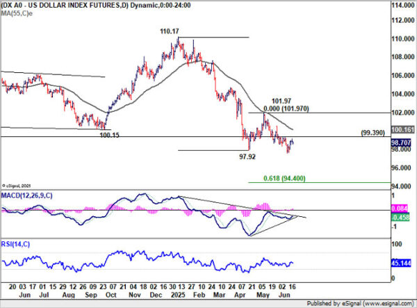 Technically, there is no clear sign of bottoming in Dollar Index yet with 99.39 resistance intact. Recent decline from 110.17 is still in favor to continue towards 61.8% projection of 110.17 to 97.92 from 101.97 at 94.40.