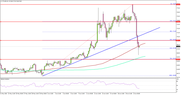 WTI Crude Oil price failed to continue higher above $78.50 against the US Dollar. There was a strong bearish reaction below the $75.00 and $72.00 levels.