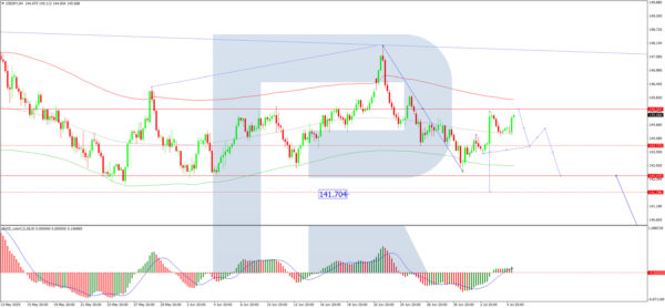 On the H4 chart, USD/JPY has formed a consolidation range around 144.33 before pushing upward. The immediate target is 145.33, after which we anticipate a downward correction towards 142.45, with potential for further declines to 141.70. This scenario is supported by the MACD indicator, where the signal line remains above zero and points firmly upward.