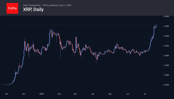 XRP set a new all-time high above $3.66, the previous one having held for more than seven years. Since Trump’s victory in the US presidential election last November, XRP has risen by almost 600%. The frenzy was followed by a pullback to $3.35 over the weekend, close to previous peaks. Still, the price is recording its sixth consecutive daily gain, trading above $3.5, indicating a solid breakout to a new price level.