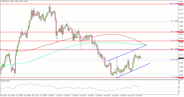 On the downside, immediate support is near the 1.3450 level. There is also a rising channel forming with support at 1.3450 on the same chart. The next key support sits near 1.3420. Any more losses could send the pair toward the 1.3365 support zone.
