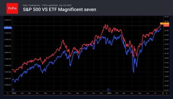 The US economy is not falling off a cliff since trade deals are reducing uncertainty. The Fed is moving towards easing monetary policy, and corporate earnings are positive. What else do stock indices need for a rally? The S&P 500 continues to break historical highs and eagerly awaits data from the so-called Magnificent Seven. Analysts expect those companies to report 14% profit growth compared to just 3% growth for the other 493 companies in the broad stock index.