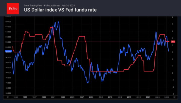 The reduced risk of a large-scale trade war between the US and the EU is increasing global risk appetite and putting pressure on the US dollar as a safe-haven asset. At the same time, the reduction in trade uncertainty is giving the Fed a free hand to ease monetary policy. A sharp cut in the federal funds rate may happen sooner than expected, contributing to the dollar’s decline.