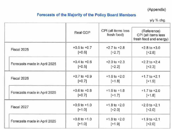 In its latest quarterly outlook, the BoJ sharply raised its inflation forecasts. Core CPI for fiscal 2025 was lifted from 2.2% to 2.7%. Core-core CPI, which excludes both fresh food and energy, jumped from 2.3% to 2.8%. The upward revisions were largely attributed to food price increases, though the BoJ still sees underlying inflation remaining subdued in the first half of the forecast horizon.