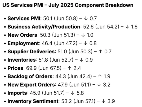 US Services PMI and its components, August 5, 2025 – Source: InvestingLive.com