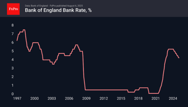 On Thursday, the Bank of England is widely expected by analysts to cut its base rate by a quarter of a point to 4.0%. These expectations are weighing on the pound against the euro and the dollar on Wednesday, as the ECB and the Fed left their rates unchanged in July. Globally, this is a game of catch-up on the part of the BoE, as since August, when the cuts began, the rate has been cut by only 100 points, with 25 more to be added on Thursday. This is significantly less than the ECB’s 235 points and commensurate with the Fed’s 100 points.