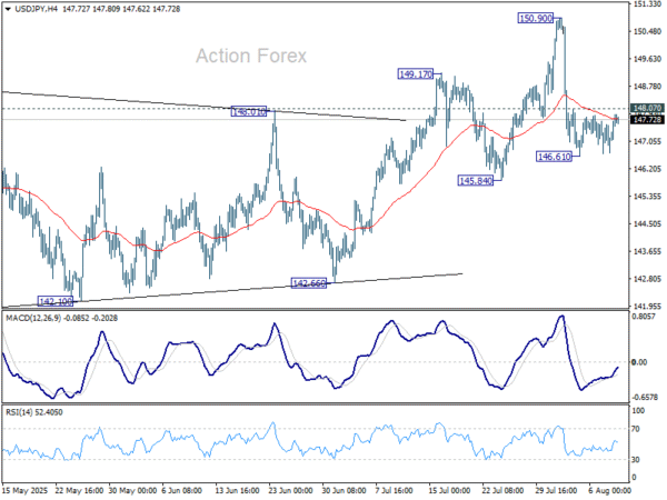 USD/JPY edged lower to 146.61 last week but turned sideway since then. Initial bias remains neutral this week first. As long as 145.84 support holds, larger rebound from 139.87 is still expected to continue. On the upside, above 148.07 minor resistance will bring retest of 150.90 high first. However, decisive break of 145.84 will indicate near term bearish reversal and target 142.66 support next.