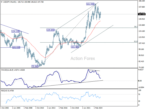 In the bigger picture, price actions from 161.94 (2024 high) are seen as a corrective pattern to rise from 102.58 (2021 low). Decisive break of 61.8% retracement of 158.86 to 139.87 at 151.22 will argue that it has already completed with three waves at 139.87. Larger up trend might then be ready to resume through 161.94 high. In case the corrective pattern extends with another fall, strong support is expected from 38.2% retracement of 102.58 to 161.94 at 139.26 to bring rebound.