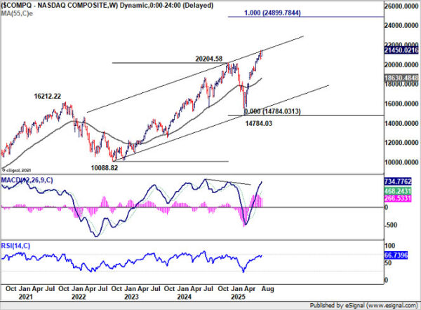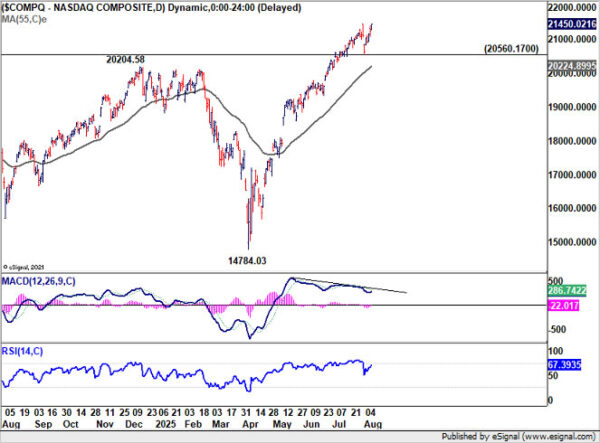 Technically, however, NASDAQ is now pressing against long-term rising channel resistance. Daily MACD continues to show bearish divergence, hinting at waning momentum. Rejection at these levels followed by a drop below 20,560.17 would signal a short-term top at least, with scope for a deeper pullback toward the 55 W EMA (now at 18630.48).