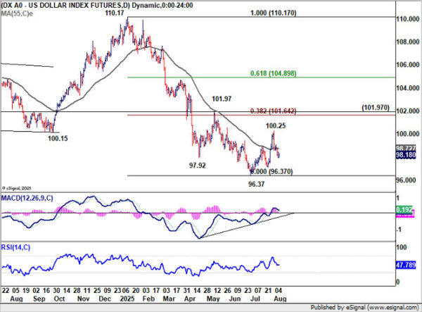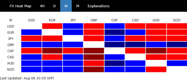 In stark contrast, Swiss Franc ended as the worst performer of the week. Slightly stronger-than-expected July CPI, ticking up to 0.2% yoy suggested less urgency for the SNB to push its policy rate from 0.00% into negative territory, but it was overshadowed by a severe new external headwind.