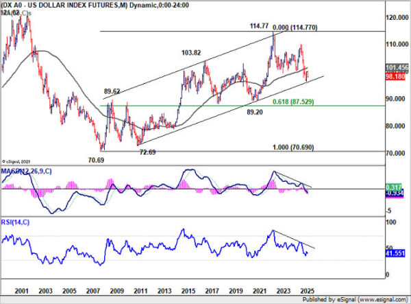 Whether the rally can extend toward 100% projection at 99.99 will depend in part on Wall Street’s ability to break NASDAQ’s long-term channel resistance mentioned above, as well as Nikkei’s momentum after clearing the record high.