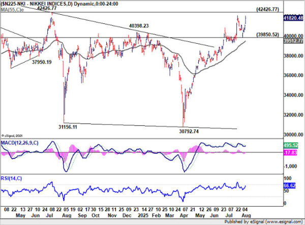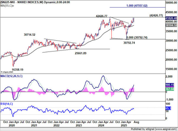 Technically, near term outlook in Nikkei will stay bullish as long as 39850.52 support holds. Retest of 42426.77 record high should be seen next. Decisive break there will resume the long term up trend. Next medium term target is 100% projection of 25661.89 to 42426.77 from 30792.74 at 47557.62.