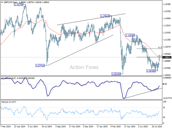 Technically, the strong bounce confirms short term bottoming at 1.0658 in GBP/CHF. Immediate focus is on 55 D EMA (now at 1.0815). Sustained trading above there will argue that fall from 1.1204 has completed. Rise from there is then seen as the third leg of the pattern from 1.0610, and should target 61.8% retracement of 1.1204 to 1.0658 at 1.0995, or even further to 1.1204 and above.