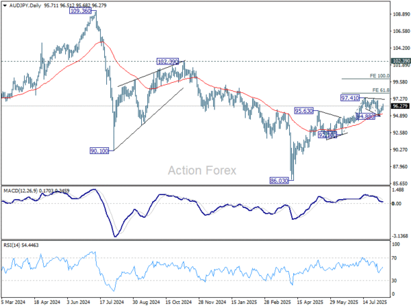 In cross-market terms, AUD/JPY‘s extended bounce suggests that near term correction from 97.41 has completed at 94.88, after hitting 55 D EMA (now at 95.09). Rise from 86.03 should be ready to resume through 97.41 to 61.8% projection of 92.30 to 97.41 from 94.88 at 98.03.