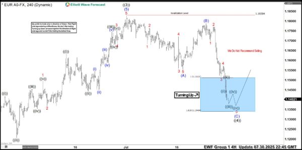 Here’s the 4-hour Elliott wave Chart from the 7.30.2025 update. In which, the rally to $1.1830 high completed wave ((3)) & made a pullback in wave ((4)). The internals of that pullback unfolded as Elliott wave zigzag correction where wave (A) ended at $1.1554 low. Then a rally to $1.1788 high-ended wave (B) bounce. Then started the next leg lower in wave (C) towards $1.1512- $1.1340 blue box area. From there, buyers were expected to appear looking for new highs ideally or for a 3-wave bounce minimum.