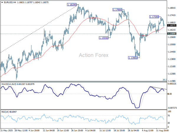 Intraday bias in EUR/USD is turned neutral again with current retreat. Some consolidations would be seen below 1.1729. Further rise is expected as long as 1.1589 support holds. Above 1.1729 will target a retest on 1.1829 high. Firm break there will resume larger up trend to 1.1916 projection level. On the downside, however, break of 1.1589 support will delay the bullish case and extend the corrective pattern from 1.1829 with another falling leg.