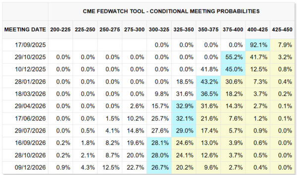 Even so, markets remain confident of a September cut. Futures now price a 92% chance of a 25bps reduction, while the odds of a jumbo 50bps cut—floated repeatedly by Treasury Secretary Scott Bessent—have effectively vanished. San Francisco Fed’s Mary Daly and others pushed back firmly on the idea of an aggressive move. Traders still expect two cuts this year, with 55% odds for the second cut in October and nearly 87% in December.