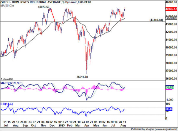 Technically, DOW finally broke to a fresh intraday record high. Sustained trading above 45,073.63 key resistance will confirm long term uptrend resumption. That would set the stage for 61.8% projection of 28,660.94 to 45,073.63 from 36,611.78 at 46,753.38. Near term outlook will stay bullish as 43,340.68 support holds, in case of a retreat.