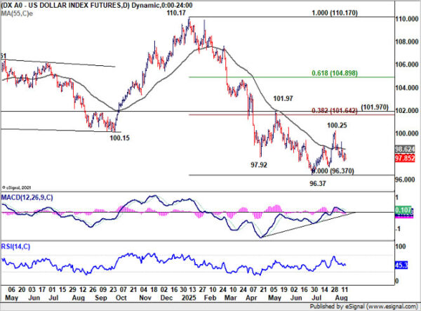 But so far, price actions from 96.37 short term bottom did little to warrant that Dollar Index is setting up bullish trend reversal. For now, while another near term bounce could be seen, outlook will stay bearish as long as 101.97 resistance zone holds, (38.2% retracement of 110.17 to 96.37 at 101.64). Break of 96.37 to resume larger down trend is still in favor.