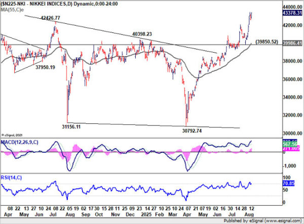 Technically, with 42426.77 key resistance cleared, Nikkei should now be targeting 100% projection of 25661.89 to 42426.77 from 30792.74 at 47557.62 in the medium term. Near term outlook will stay bullish as long as 39850.52 support holds, in case of retreat.