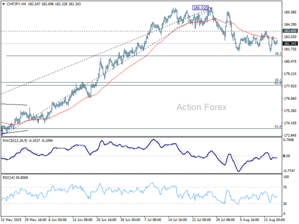 Even against the Swiss Franc, where monetary policy divergence should favor Yen, the currency has failed to mount a convincing rebound. CHF/JPY’s pullback from 186.02 short term top is losing momentum as seen in 4H MACD. Even in case of another fall, downside could be contained by 38.2% retracement of 173.06 to 186.02 at 181.06, which is close to 55 D EMA (now at 181.26). Break of 183.60 resistance will bring retest of 186.02 high, with prospect of resuming larger up trend.