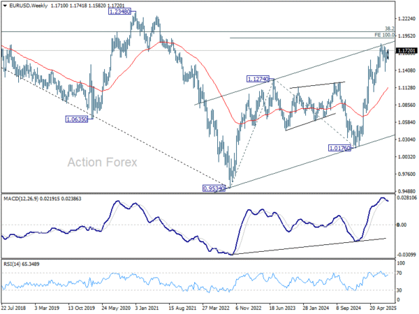EUR/USD gyrated lower to 1.1582 last week but rebounded strongly from there. Late breach of 1.1729 resistance suggests that rise from 1.1390 is resuming. Initial bias is now on the upside this week for retesting 1.1819 high first. Firm break there will resume larger up trend. For now, risk will stay on the upside as long as 1.1582 support holds, in case of retreat.