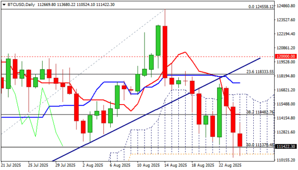 BTCUSD remains in red for the third straight day and pressures again key supports at 111370 (100DMA / 50% retracement of 98182/124558) and 110722 (daily Ichimoku cloud base) after fully retracing Friday’s post-Powell rally and dipping to the lowest since July 9.