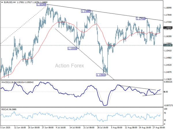EUR/USD dipped to 1.1573 last week but quickly recovered. Overall outlook is unchanged that corrective fall from 1.1829 should have completed with three waves down to 1.1390. On the upside, above 1.1741 will bring retest of 1.1829 high first. Firm break there will resume larger up trend. However, sustained break of 1.1573 will dampen this view, and indicate that corrective pattern from 1.1829 is extending with another falling leg towards 1.1390 again.